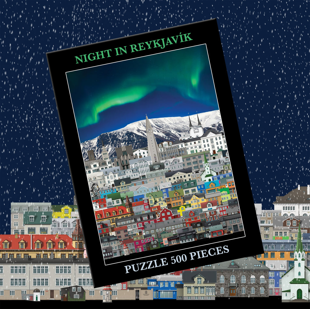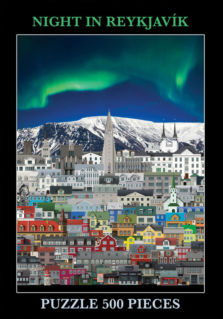 500 bita Reykjavíkur púsl undir norðurljósum.